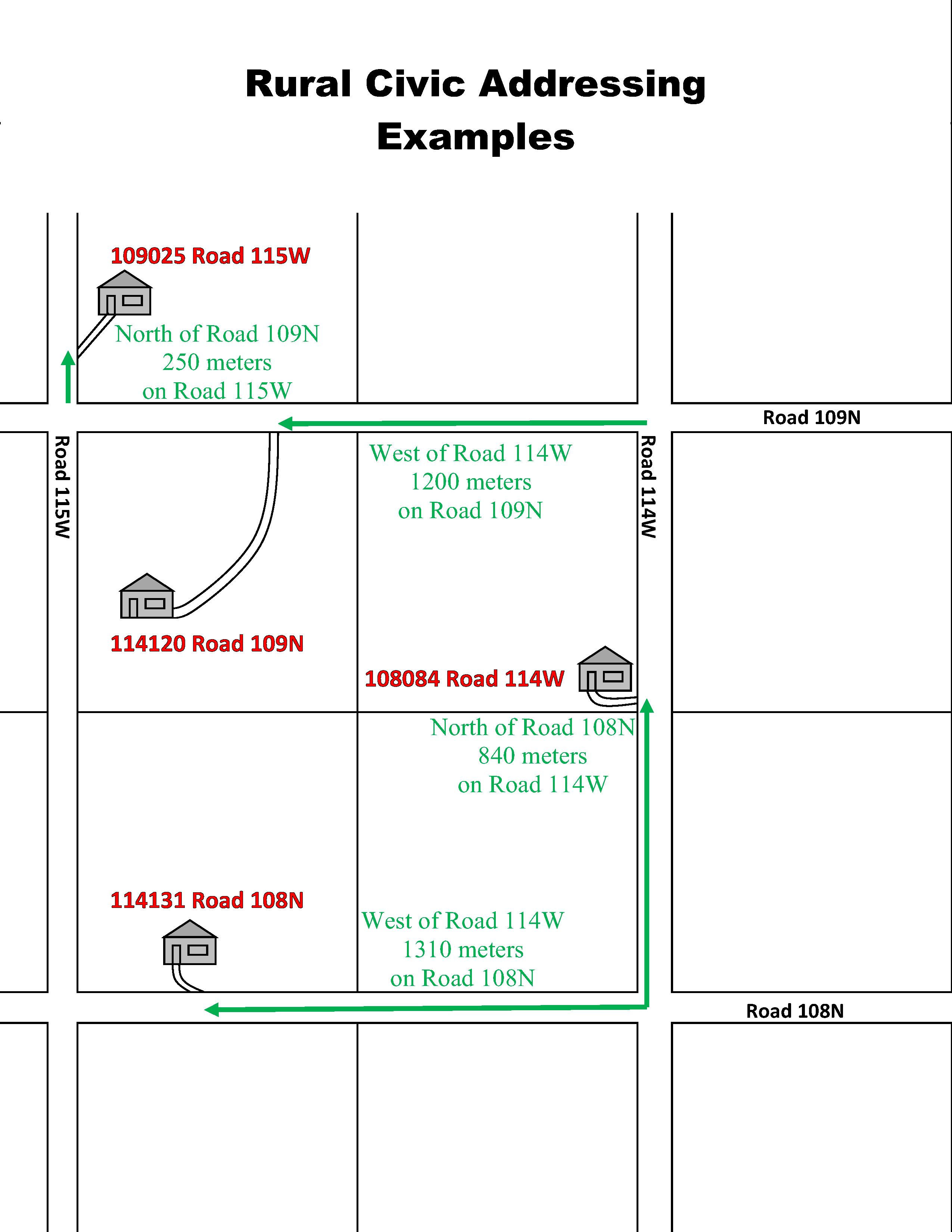 Civic Number 108084 Road 114W will be used in this explanation to illustrate how the system works. The system is based on measurement, and because of this your Civic Number is not of use unless you also know what road the driveway is off of. For instance, there is the potential that multiple driveways could be assigned Civic Number 108084. But when you know that Civic Number 108084 is on Road 114W, there is only one possible location. If this is confusing come back to it once you understand how numbers are assigned.